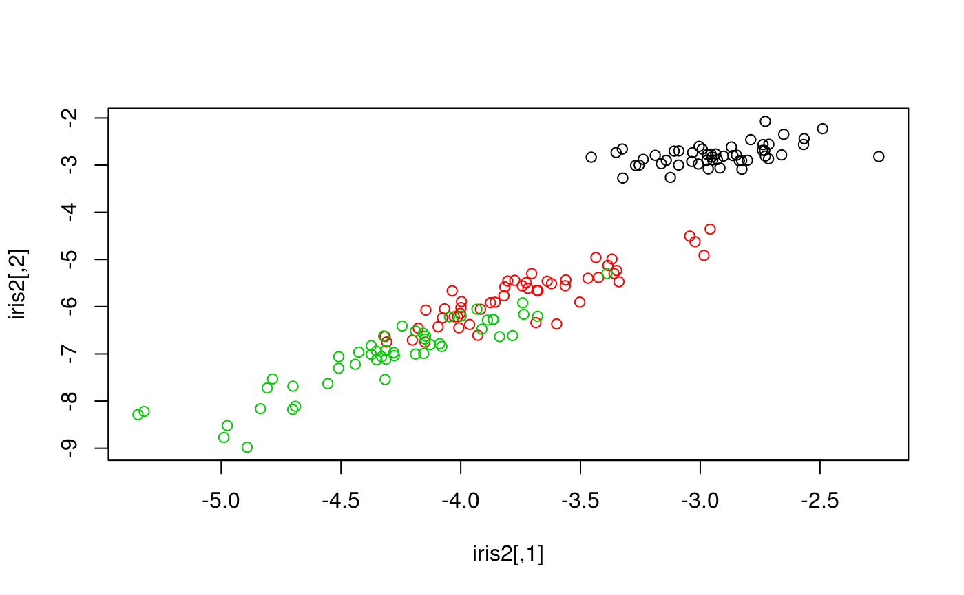 iris2 = autoencode(x, 2)Since this function only returns the learned features, one cannot reuse the trained autoencoder. This is useful, however, for low-dimension visualizations: